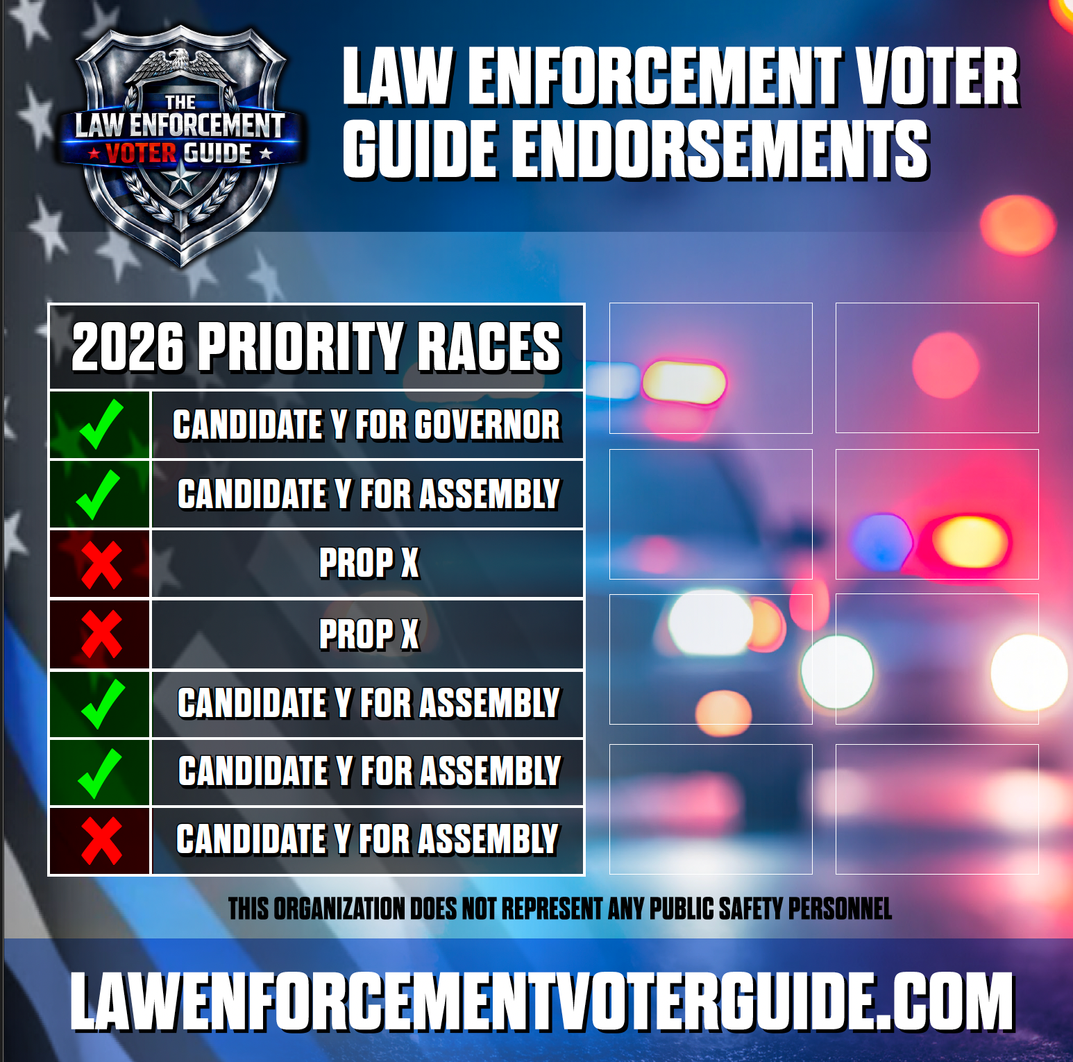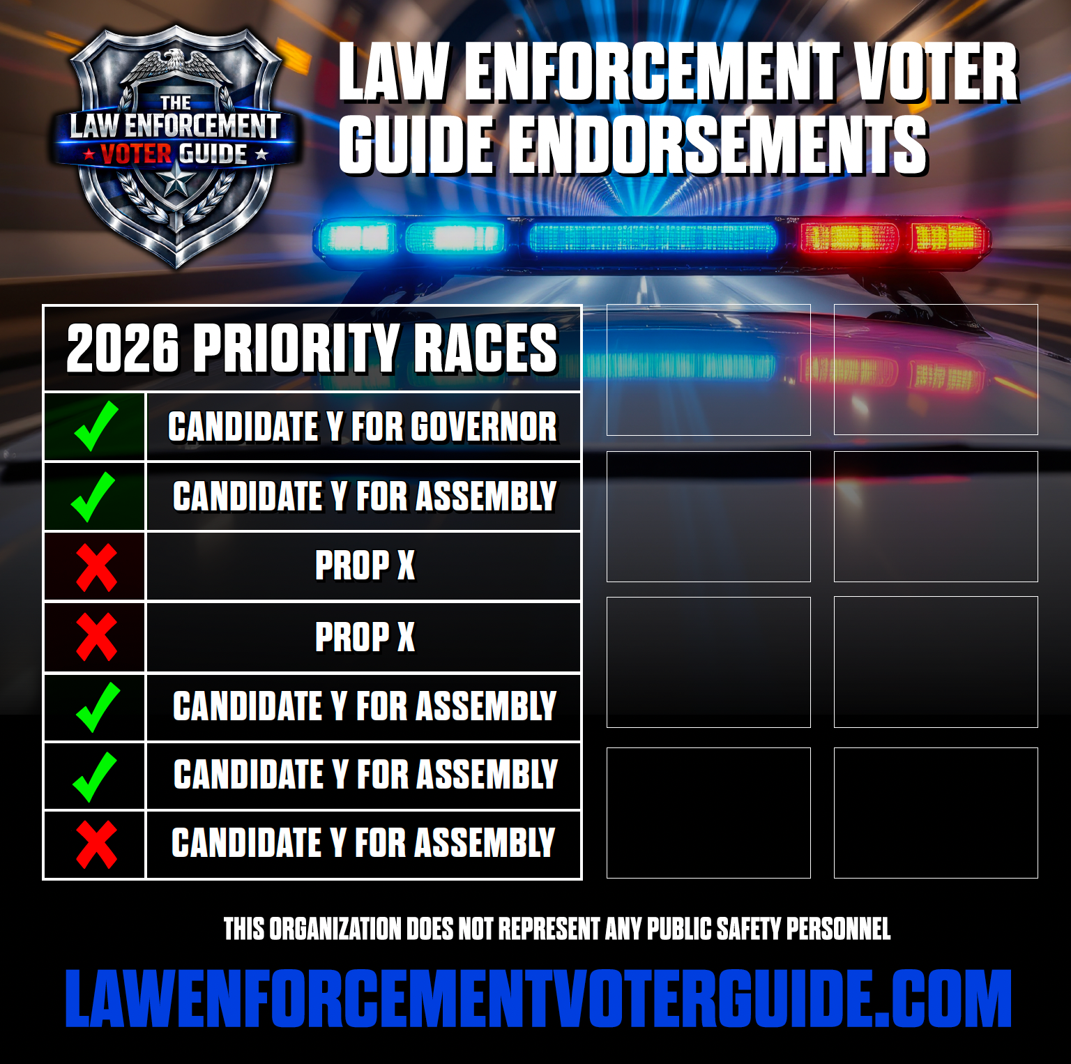 The Law Enforcement Voter Guide exists to provide California voters with clear, trustworthy, law-enforcement-informed guidance on candidates and ballot propositions that impact public safety and policing.